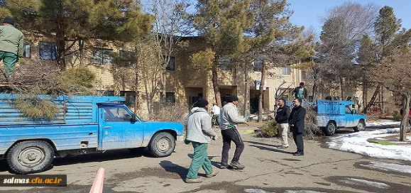 کارگران شهرداری در حال هرس درختان مرکز