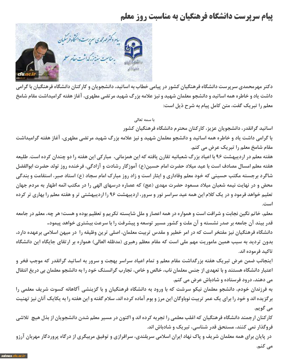 امتیاز دهید : پیام دکتر مهر محمدی سرپرست محترم دانشگاه فرهنگیان به مناسبت روز معلم سهشنبه 12 اردیبهشت 1396 ساعت 7:51
