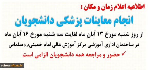 امتیاز دهید : اطلاعیه اعلام زمان و مکان انجام معاینات پزشکی دانشجویان مرکز سهشنبه 9 آبان 1396 ساعت 9:36