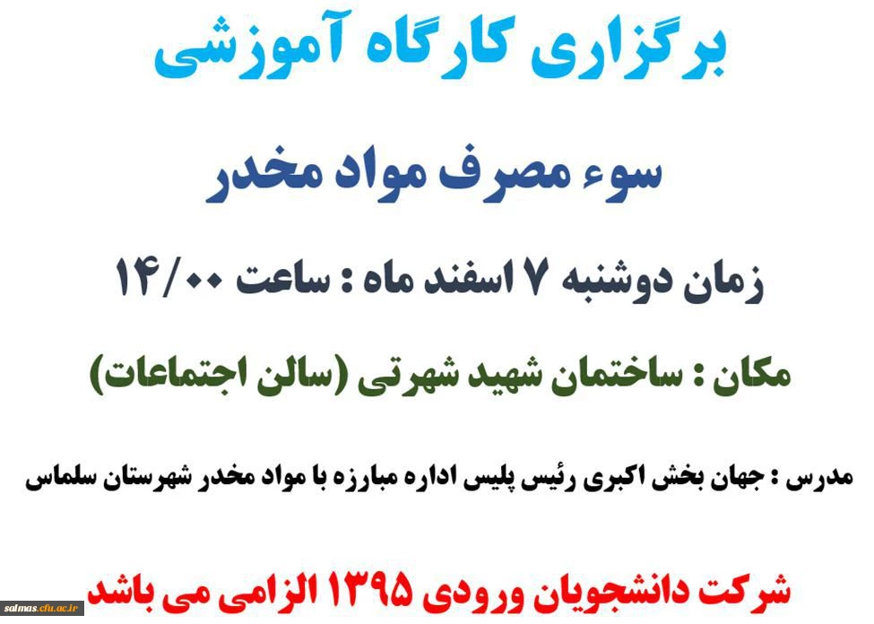 برگزاری کارگاه آموزشی سوء مصرف مواد مخدر دوشنبه 7 اسفند
