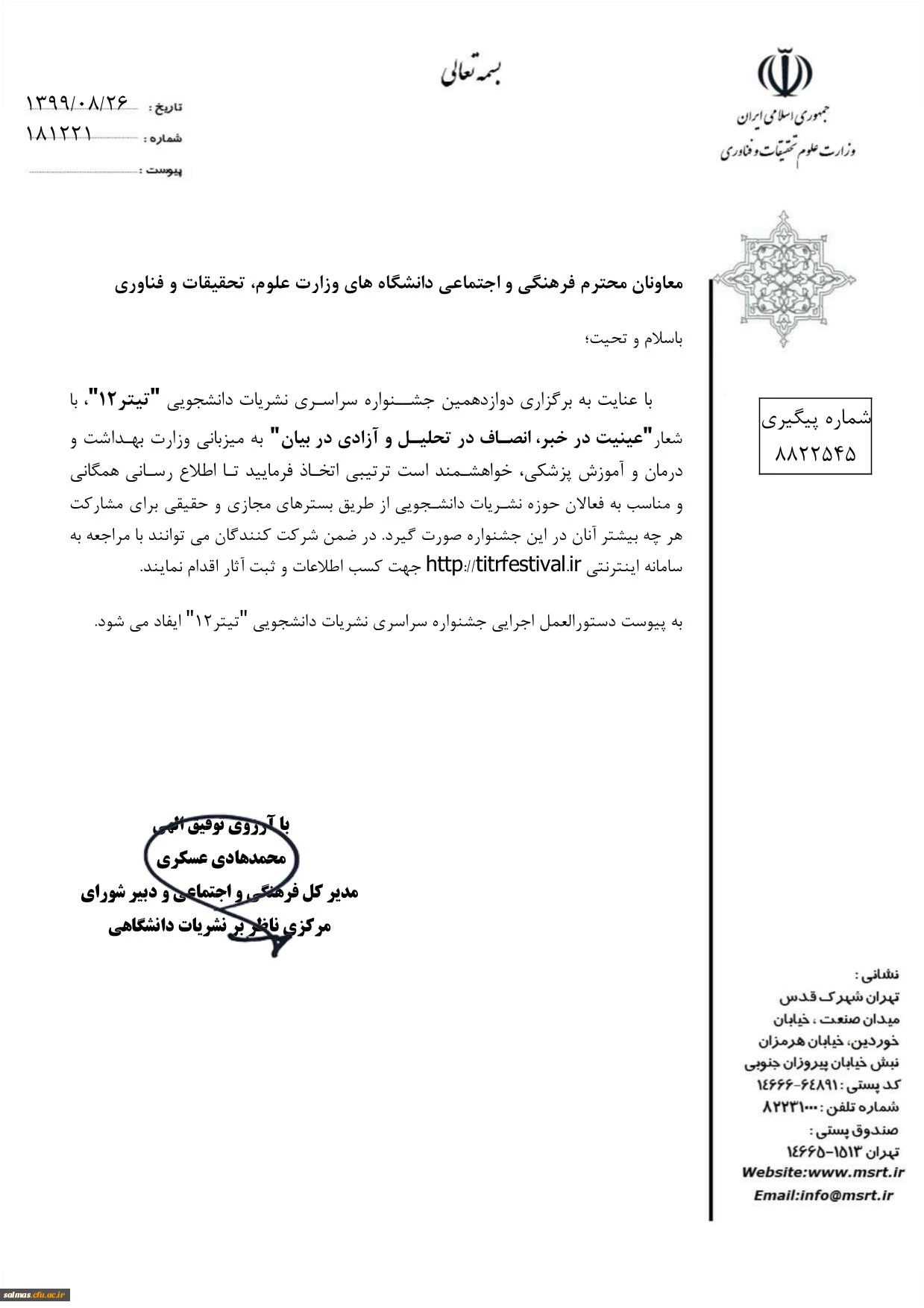 امتیاز دهید : برگزاری دوازدهمین جشنواره سراسری نشریات دانشجویی « تیتر12» چهارشنبه 5 آذر 1399 ساعت 19:32